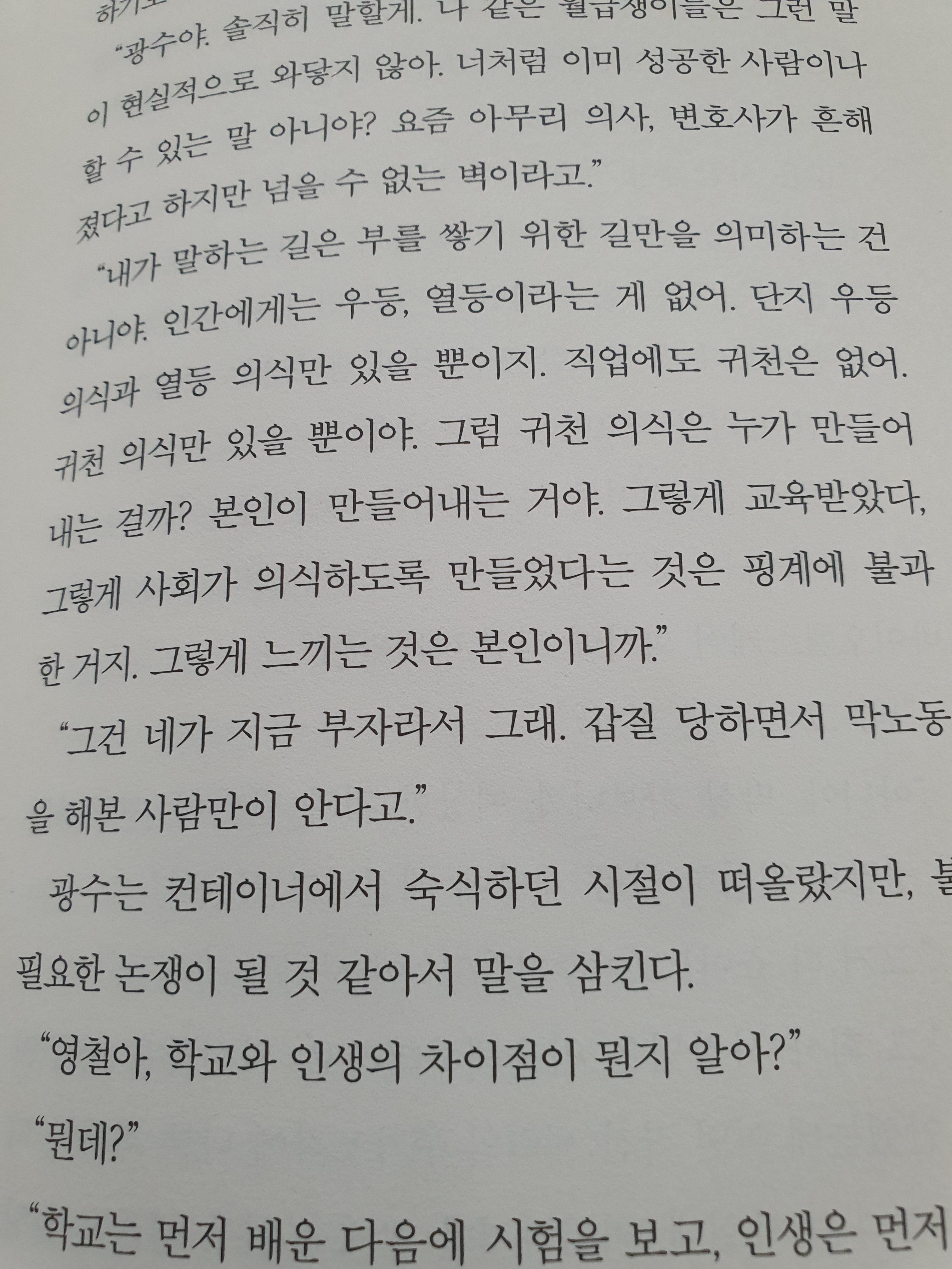 인간에게는 우등, 열등이라는 게 없어. 단지 우등의식과 열등의식만 있을 뿐이지. 직업에도 귀천은 없어. 귀천 의식만 있을 뿐이야. 그런 귀천 의식을 누가 만들어 내는 걸까? 본인이 만들어 내는 거야. 그렇게 교육받았다. 그렇게 사회가 의식하도록 만들었다는 것은 핑계에 불과한 거지. 그렇게 느끼는 것은 본인이니까. 많은 사람들이 달걀을 한 바구니에 담을지 여러 바구니에 담을지, 어느 바구니에 담을지 고민을 하지. 하지만 달걀을 낳는 닭은 한 마리만 가지고 있어. 다시 말하면 달걀의 분배보다 더 중요한 것은 닭의 생사라는 거야. 전문직이든 회사원이든 사업가이든 여러 마리의 닭을 소유하는 것에 집중해야 하지.