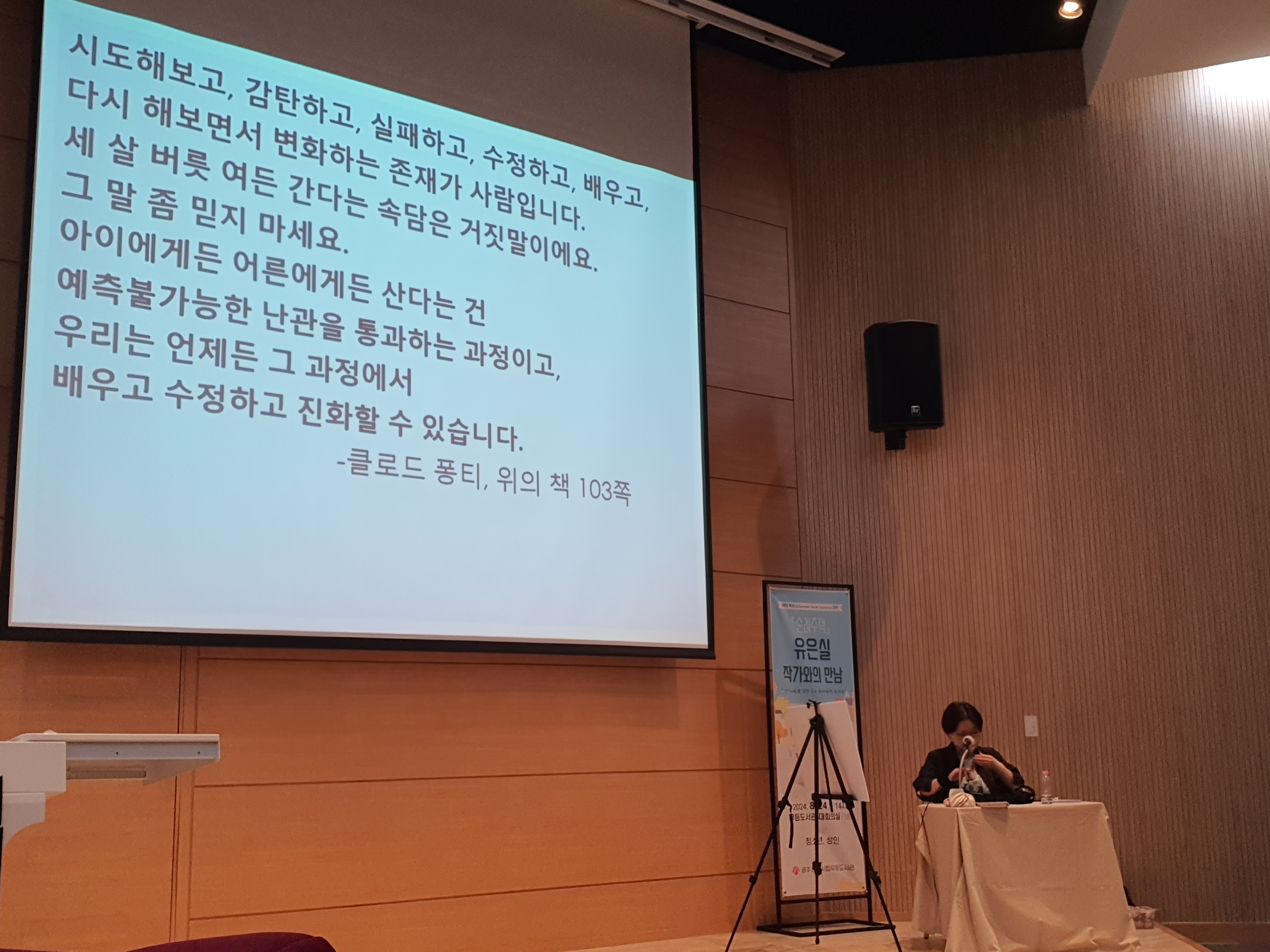 강연이 시작되기 전 약 40분 동안, 전시된 책 중 세 권의 동화를 읽었다. 『나의 독산동』, 『송아지 똥』, 『그해 가을』이었다. 세 권을 읽는 동안 나는 유은실 작가님에게 점점 더 깊이 빠져들었다. 단순한 어린이 동화책이라고 생각했지만, 그 속에는 알 수 없는 슬픔과 감동이 담겨 있었다. 무대 준비를 위해 강연 관계자들이 내 옆을 분주히 오갔지만, 나는 그들의 움직임에 전혀 신경 쓰지 않고 책 속에 몰두했다.