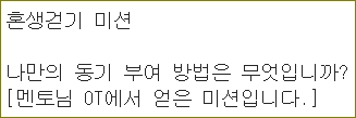 그와 동시에 혼생 걷기에서 매일 주어진 미션을 시각화하는 하는 것입니다. 미션은 매일 달라집니다.