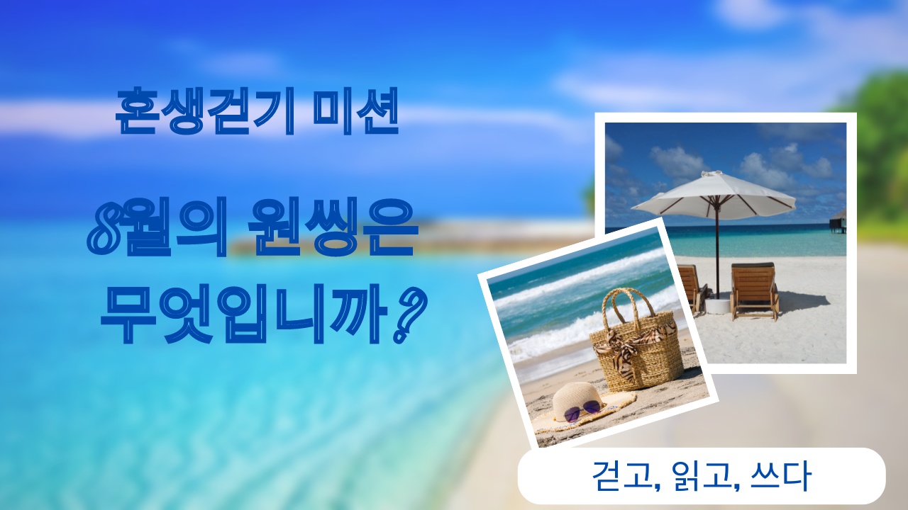 | 혼생걷기 미션 덥지요? 저도 덥습니다. 그럼에도 불구하고 우린 걸을 수 있습니다. 걷기는 제게 만병통치약입니다. 몸과 마음을 치유해주고 생각을 통해 우린 부자의 길을 걸어가고 있습니다. 걸어가다 힘들면 물마시고 쉬어가야지요. 또 재충전하고 걷습니다.^^ 8월의 당신의 원씽~ 이것만큼은 한다!! 무엇일까요? |