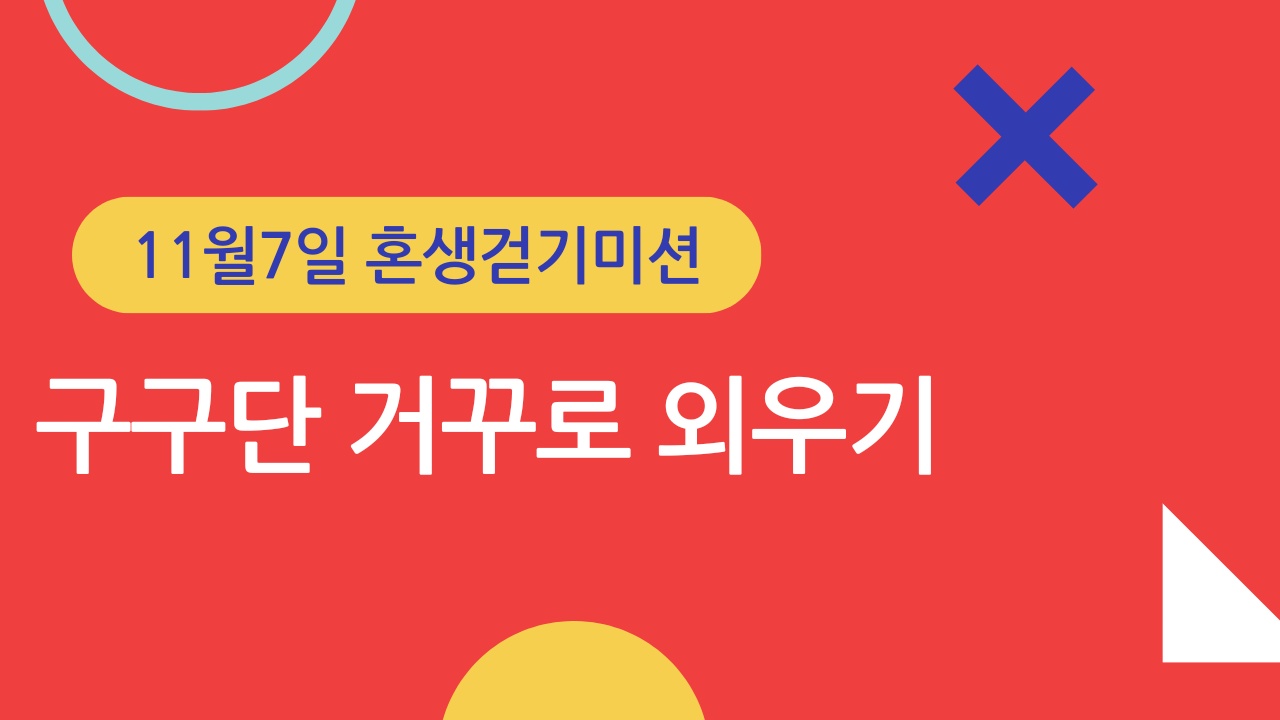 | 우리 구구단 거꾸로 외우며 두뇌에 자극주며걸어볼까요? | 아주 느리게 오랜 시간에 걸쳐서 한 번 외워봤네요. ㅎㅎㅎ , 쉽지 않네요. 정말로 머리가 녹이 슬까요? 정말 오래간만에 초등학교 시절로 돌아간 기분입니다. ^ |