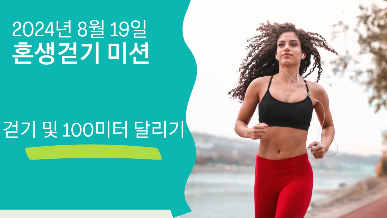 | 오늘 미션입니다. 걷기 하시며 100미터 달리기 나만의 속도로 진행해보겠습니다. 욕심내지 않고 100미터입니다^^♡ |