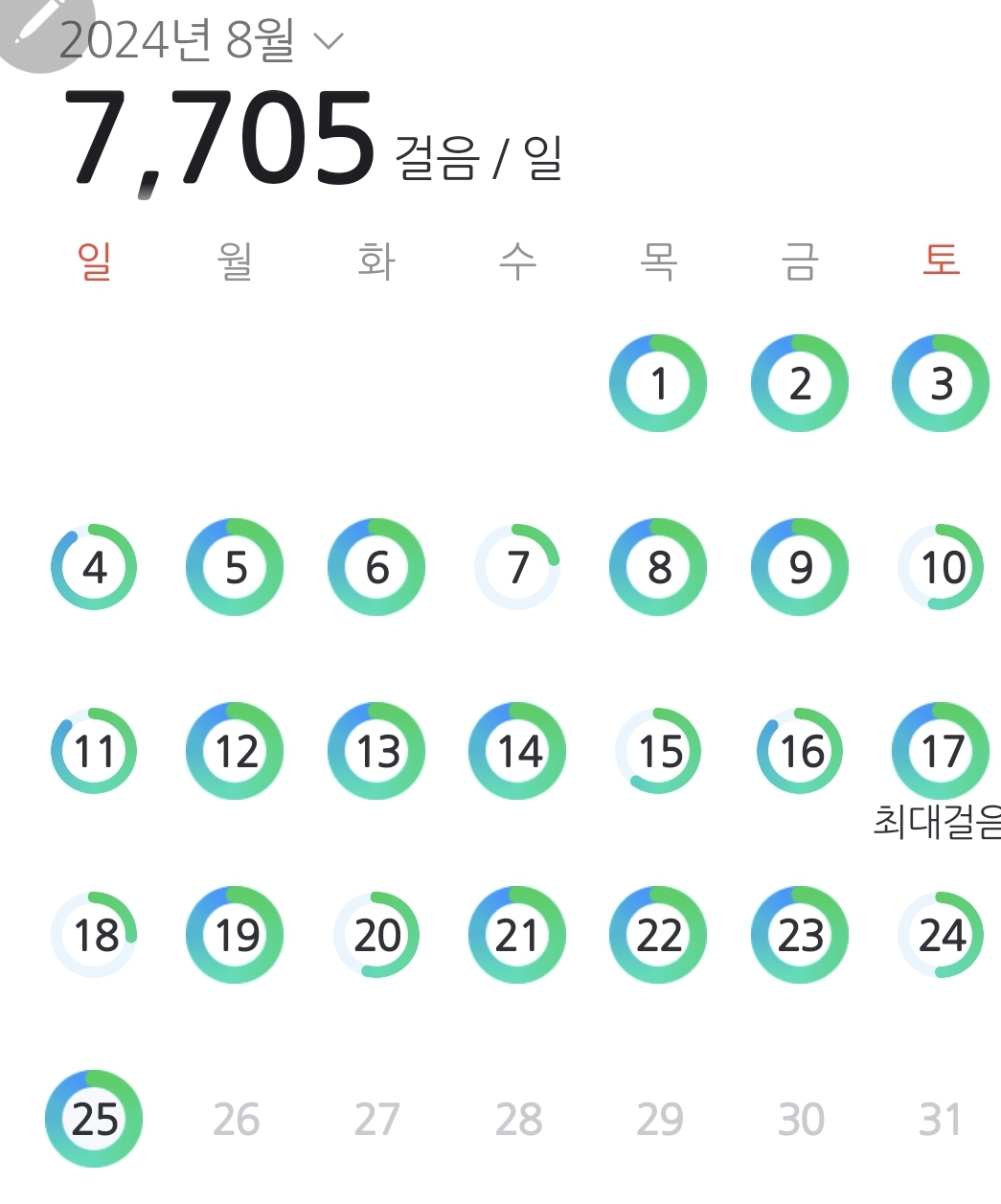 8월 세번째주는 화요일에 목표 7500보를 달성하지 못하였군요. 왜 달성하지 못하게 되었는지는 잘 모르겠습니다. 걷기 목표를 건강을 위한 최선책인것을 알아야 한다. 그러기에 단순 걷기로 생각하지 말고 나의 미래을 위한 투자로 생각하고 절대성을 갖도록 해야 겠다.