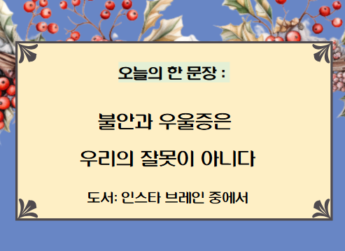 어찌 이 말이 나에게 위로가 되는 것일까? 불안에서 오는 스트레스가, 해야 할 일이 많는데, 시간은 없고, 문제는 해결이 안되고'하는 이런 우울감들이 결국 나를 지키려는 몸부림이라는 사실이 알았고, 이것 또한 내 잘못이 아니라는 것'이 내게 희망을 가져다 준다. 지금 내 몸안에서, 내 뇌 속에서 부지런히 나를 보호하기 위해 활동하고 있다'는 생각이 나에게 위로와 마음의 안정을 오하려 가져다 준다니, 참 아이러니하다. 그러나 열심히 내 몸이 나를 위해서 일하고 있으니, 어쨓든 해결책을 찾아나가는 것이 매우 중요하다는 것을 다시한번 깨닫게 된다. 역시 책은 우리에게 도움을 주고, 지혜와 지식을 줘서 우리를 건강하게 그리고 우리가 행복하도록 만들어 준다는 사실을 발견하게 된 시간이 되었다.