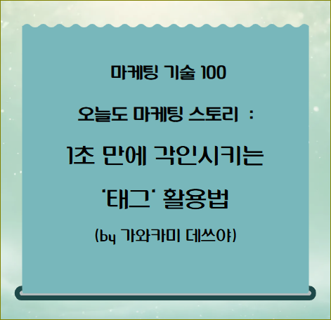 스토리 기술 독보적인 스토리는 독보적인 상품이나 서비스를 제공하며 알기 쉬운 태그를 달고, 라벨을 붙여야 비로소 완성된다. 꼭 기억하기 차별 포인트를 한마디로 표현하는 태그를 만들어 보자.