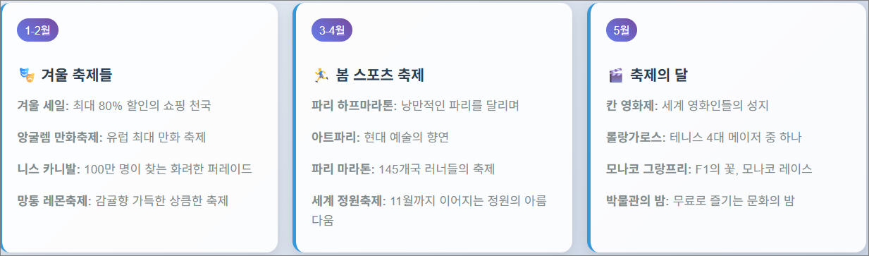 - 축제 시기에 맞춰 여행 계획을 세우시면 더욱 풍성한 프랑스 경험이 가능합니다.
