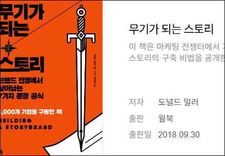3, 스토리가 회사를 키운다. 무언가를 원하는 어느 '캐릭터'가 '난관에 직면하지만 결국은 그것을 얻게 된다. 절망이 절정에 달했을 때 '가이드'가 등장해 계획을 내려주고 행동을 촉구한다. 그 행동 덕분에 실패를 피하고 성공으로 끝맺게 된다.
